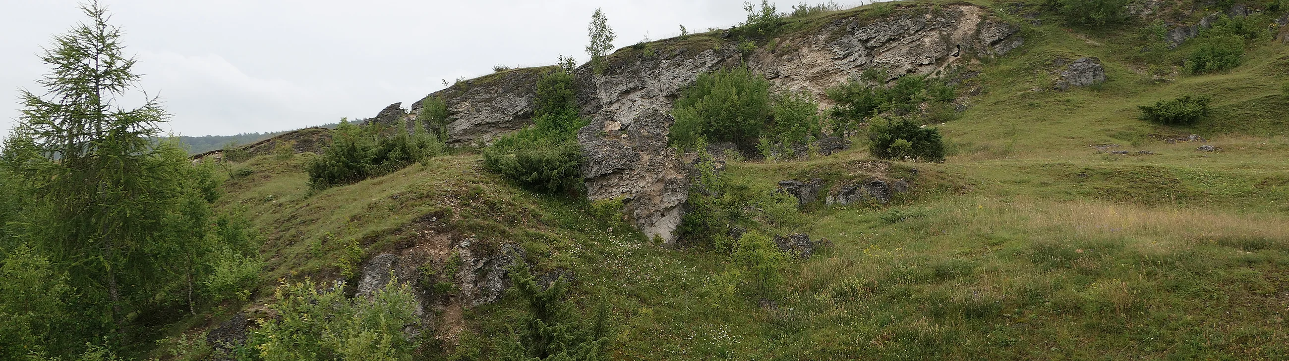 Ausgeworfene und zertrümmerte Scholle (Impaktgestein, tX), intensive Zerbrechung und anschließende Silizifizierung mit Bildung von Hornsteinen. Gute Aussicht über Teile des Rieses.