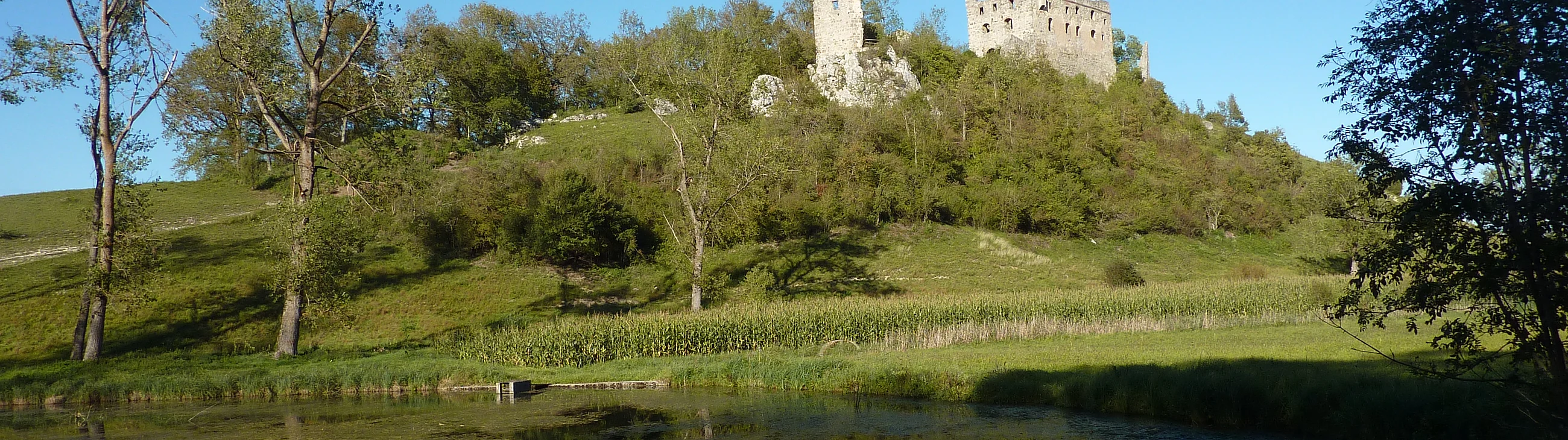 Die Ruine der ehemaligen Stauferburg Niederhaus thront weit sichtbar auf einem schmalen felsigen Höhenrücken über dem Kartäusertal. Die Burg wurde aus dem Impaktgestein Suevit errichtet.