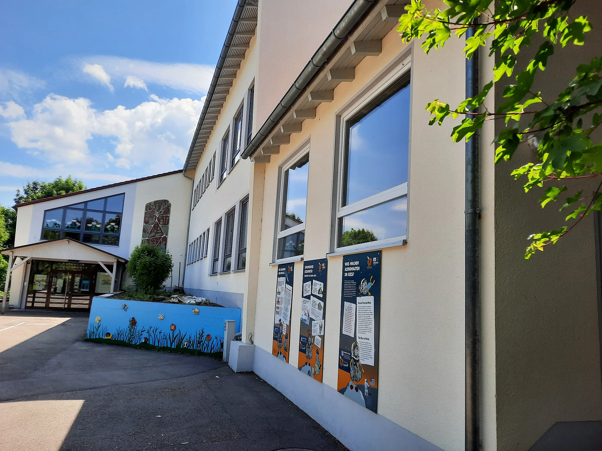 Die Kinder-Infostelle an der Geopark Ries Grundschule Reimlingen besteht aus drei kindgerecht gestalteten Thementafeln, die spielerisch Wissen vermitteln.