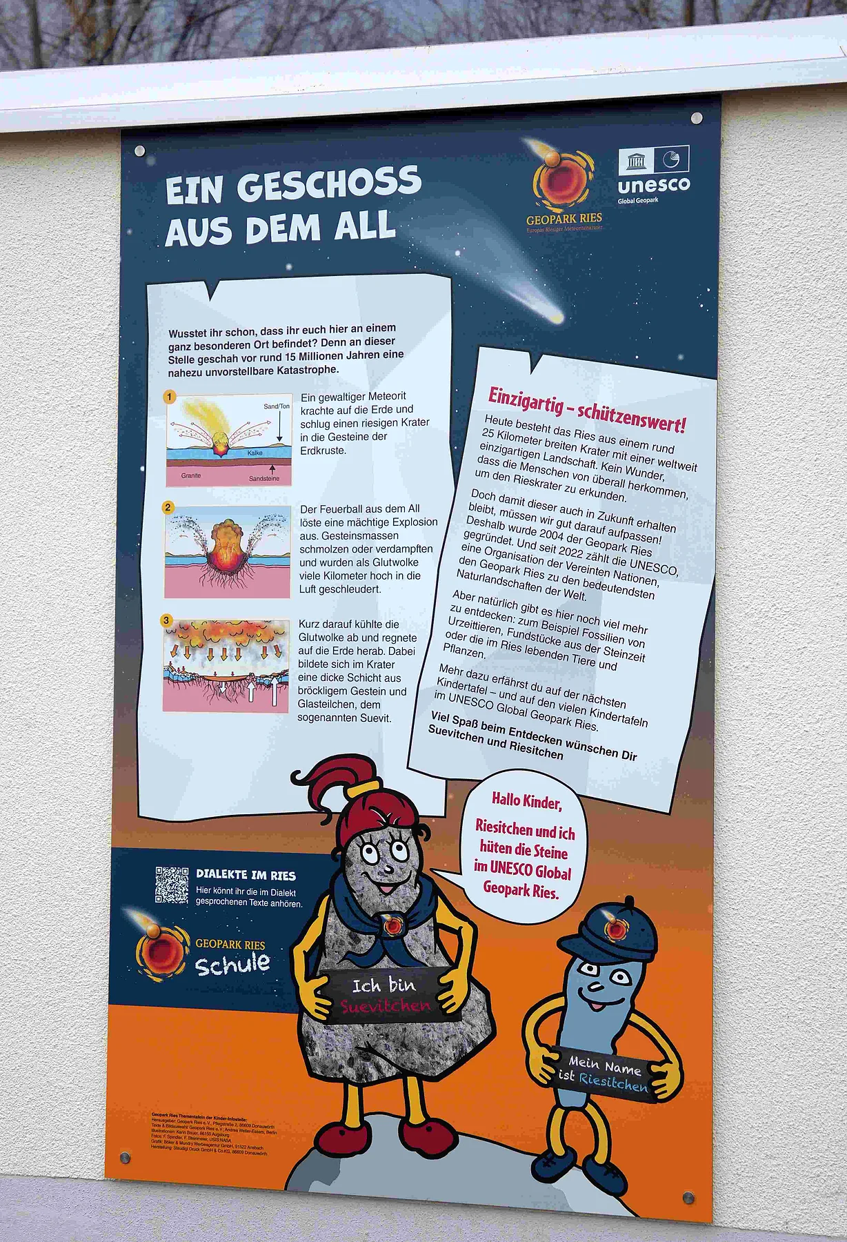 Im Mittelpunkt der Thementafeln stehen die Geopark Ries-Maskottchen „Suevitchen“ und „Riesitchen“, die den jungen Besucherinnen und Besuchern Spannendes über den Meteoriteneinschlag vor rund 15 Millionen Jahren und seine Auswirkungen auf die Region erzählen.