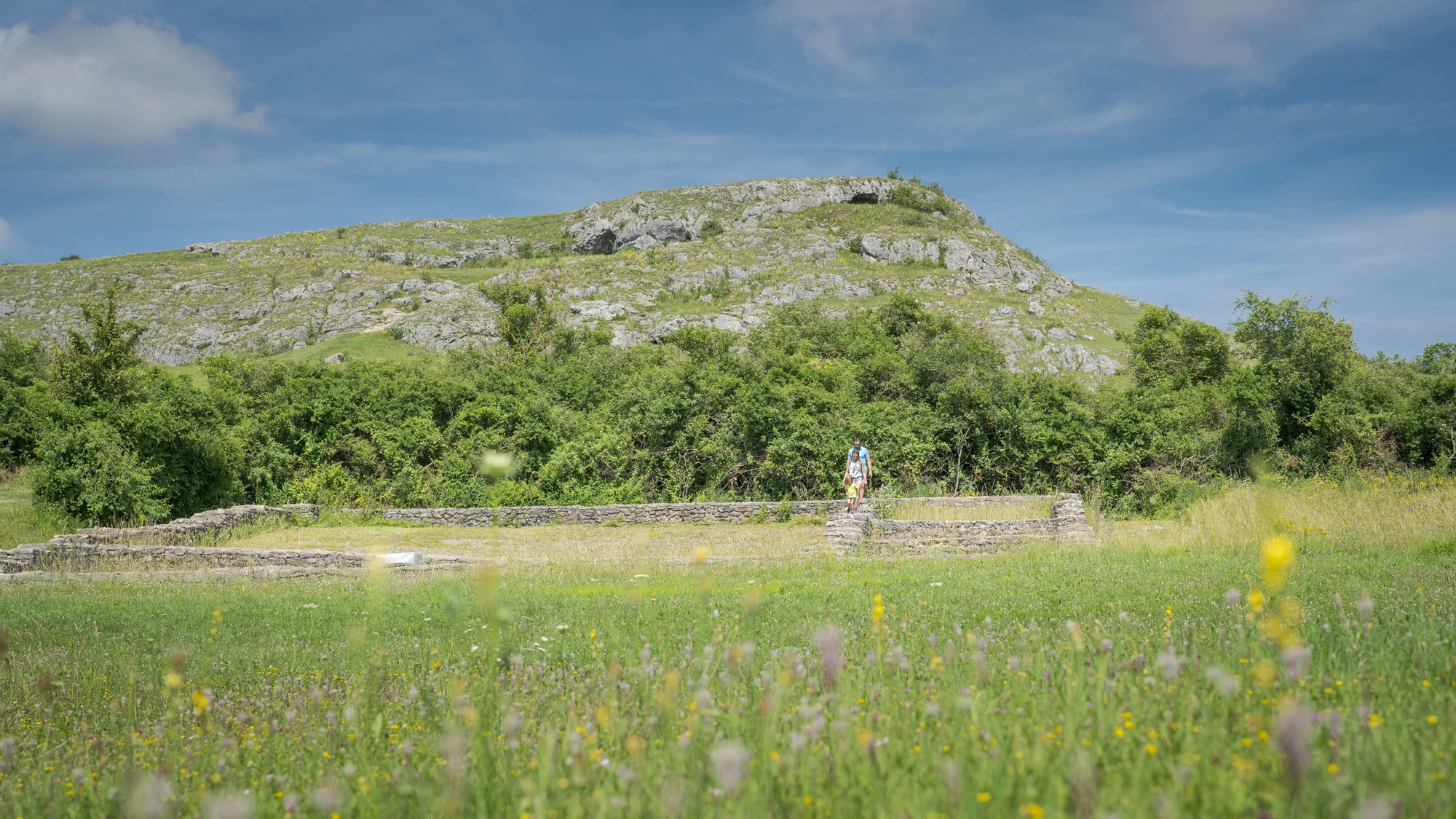 Auf einer Wiese finden sich Grundmauern eines Gebäudes. Dahinter erhebt sich ein felsiger Hügel.