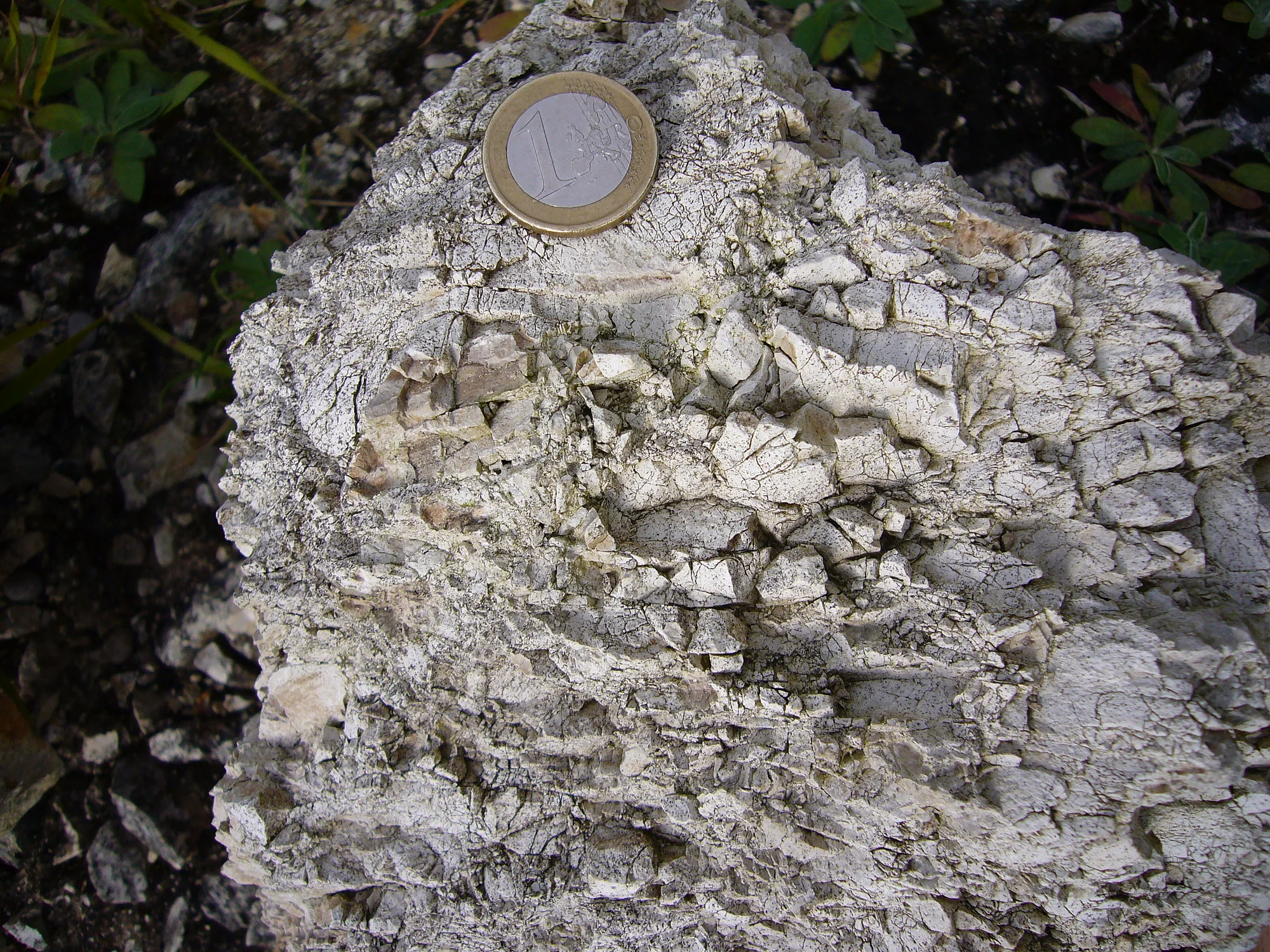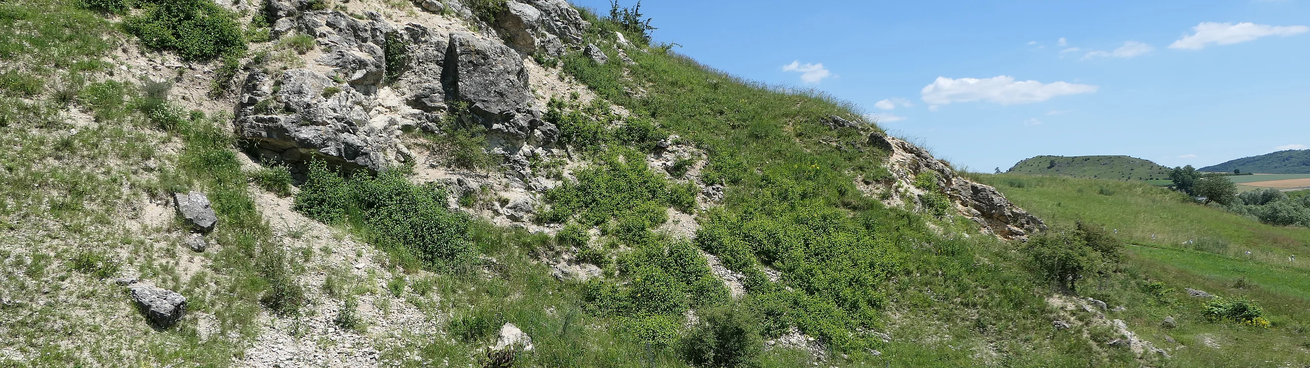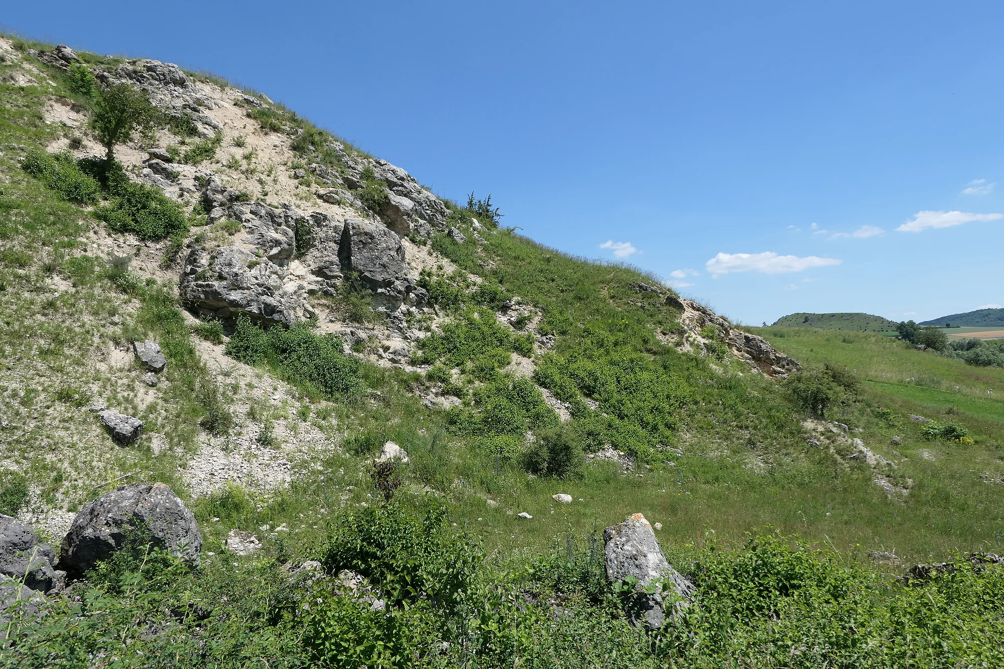 Der Aufschluss liegt in der Nähe des südöstlichen inneren Kraterrings. Kleiner Aufschluss im Hang aus dickbankigen Kalken des Malm Delta. Die Kalke sind teils brecciiert und vergriest mit deutlich erkennbarer Mörteltextur. An einer verkippten Scholle ist eine Schlifffläche erkennbar. Bei dem Aufschluss handelt es sich um eine Malmkalk-Scholle innerhalb der Bunten Trümmermassen. Der Aufschluss wurde wahrscheinlich früher ausgebeutet.