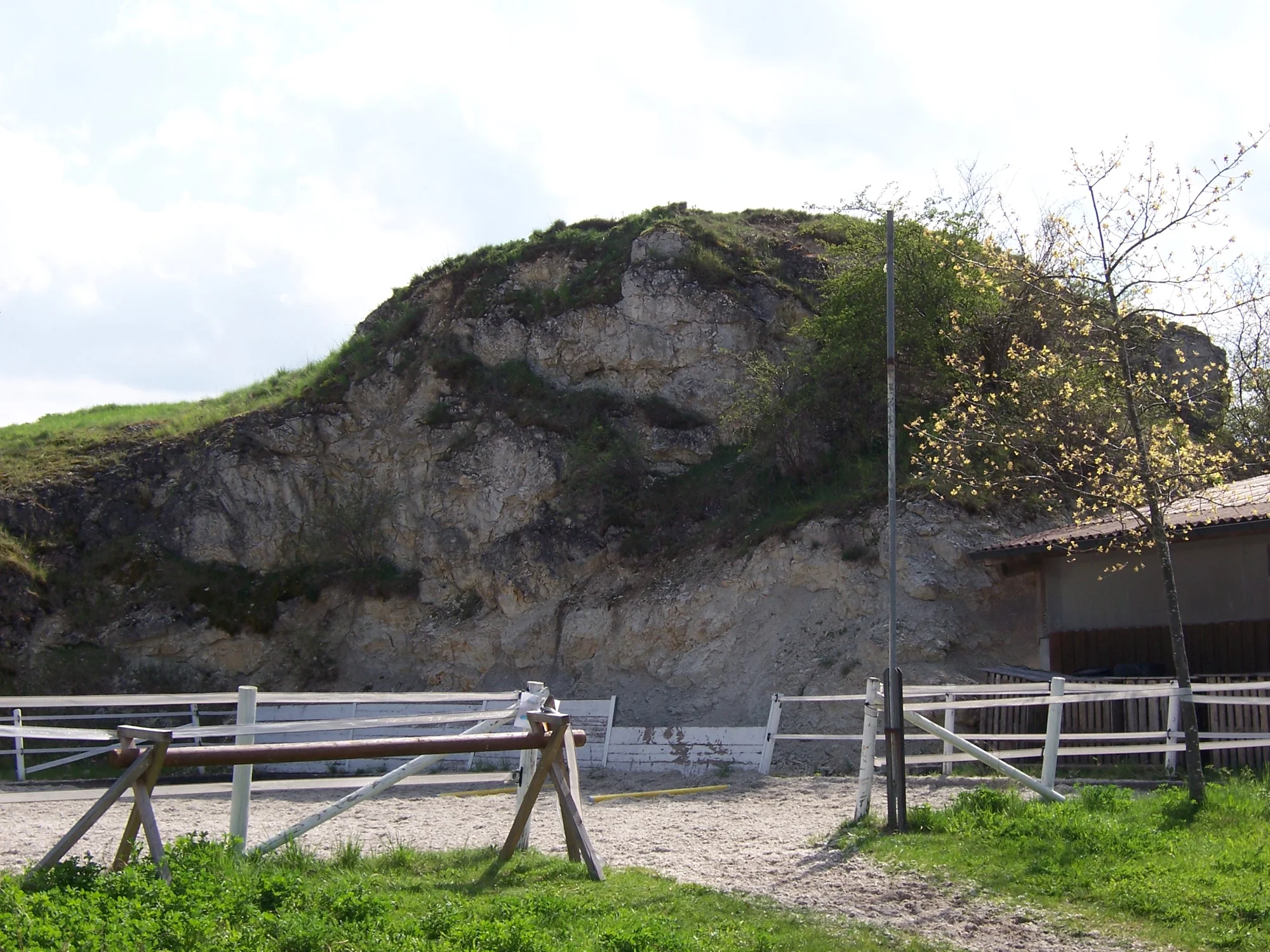 Ein großer Felsblock ist mit Gras bewachsen. Im Vordergrund sind mehrere Zäune zu sehen.