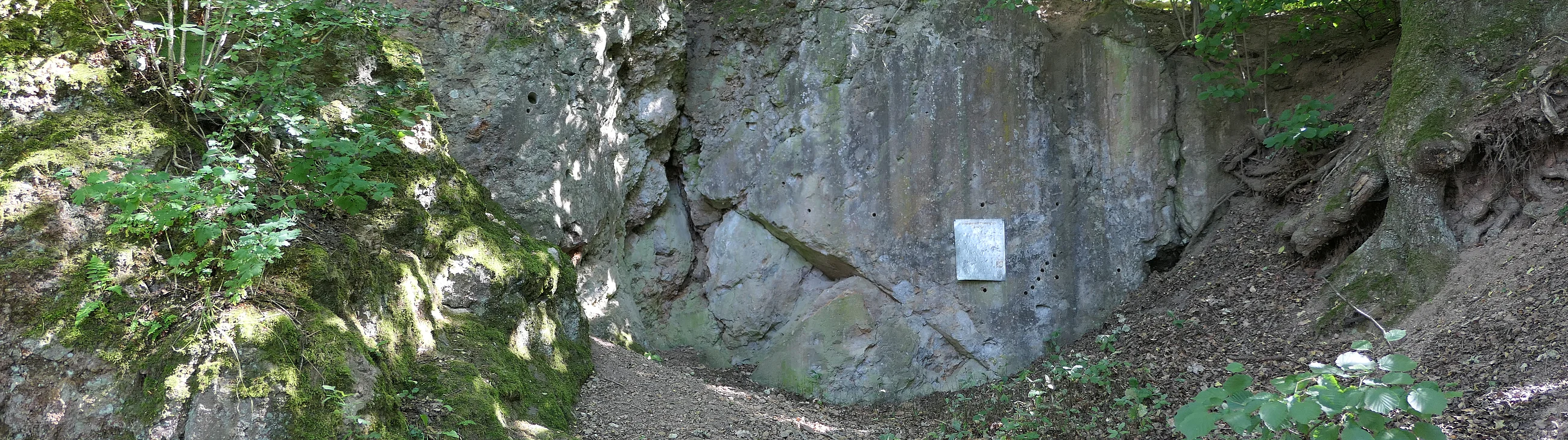 Der Aufschluss liegt ca. 1,5 km innerhalb des nordöstlichen Kraterrandes. In diesem kleinen ehemaligen Steinbruch am Waldrand ist Impaktschmelzbreccie, früher als Roter Suevit bezeichnet, aufgeschlossen. Das Vorkommen hat eine max. Ausdehnung von ca. 4 m x 1,50 m. Bisher wurde ein vergleichbares Gestein nur noch in Amerbach (heute nicht mehr zugänglich) sowie bei der kürzlich vom Bayerisches Landesamt für Umwelt in Enkingen niedergebrachten Bohrung gefunden. Auch in der Forschungsbohrung Nördlingen 1973 wurde kein vergleichbares Gestein erbohrt. Bei der Impaktschmelzbreccie handelt es sich um ein rötliches, blasenreiches Gestein mit einer vollständig kristallinen Grundmasse. In diese Grundmasse eingelagert findet man Mineral- und Gesteinsfragmente kristalliner Gesteine bis zu einer Größe von ca. 30 cm. Sedimentäre Anteile liegen nicht vor. Die Gesteinsfragmente zeigen unterschiedliche Beeinflussung durch die Stoßwellenmetamorphose. Sie sind aber im Unterschied zum Suevit durch die hohen Temperaturen nach dem Einschlag häufig thermisch überprägt und rekristallisiert. In einigen Fragmenten findet man sogar Coesit. Auch die Impaktschmelzbreccie selbst ist stark thermisch überprägt und rekristallisiert und zeigt in Blasen häufig Hämatit, Chalcedon und Zeolithe. Die Vorkommen dieses Gesteinstyps werden als Teile von Impaktschmelze gedeutet, die mit Kristallinfragmenten gemischt wurde und aus dem zentralen Kraterbereich in die Nähe des Kraterrandes transportiert wurde.