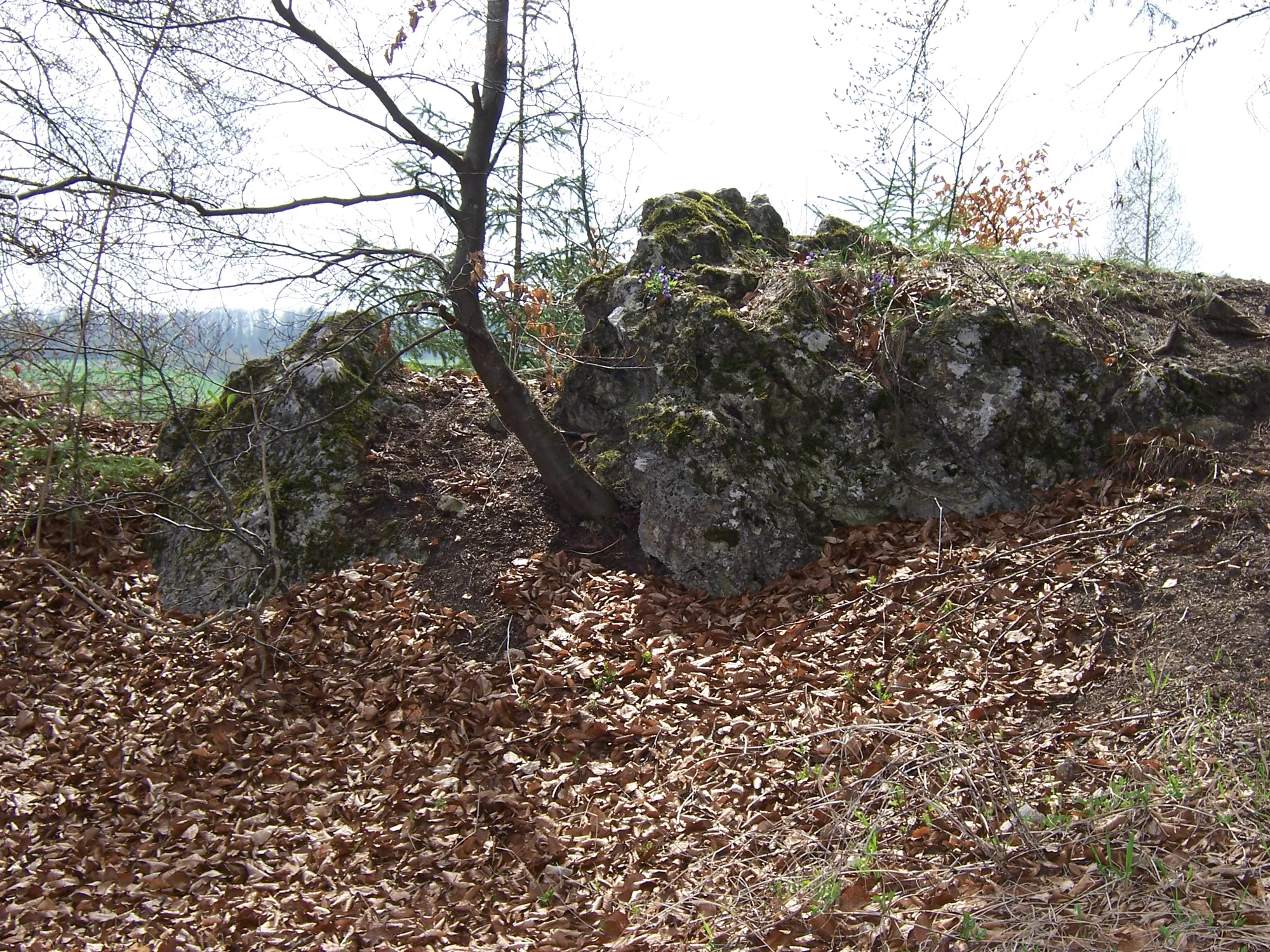 An einem Waldrand befindet sich auf einem Wall ein verwitterter und mit Moos überwachsener Felsblock.