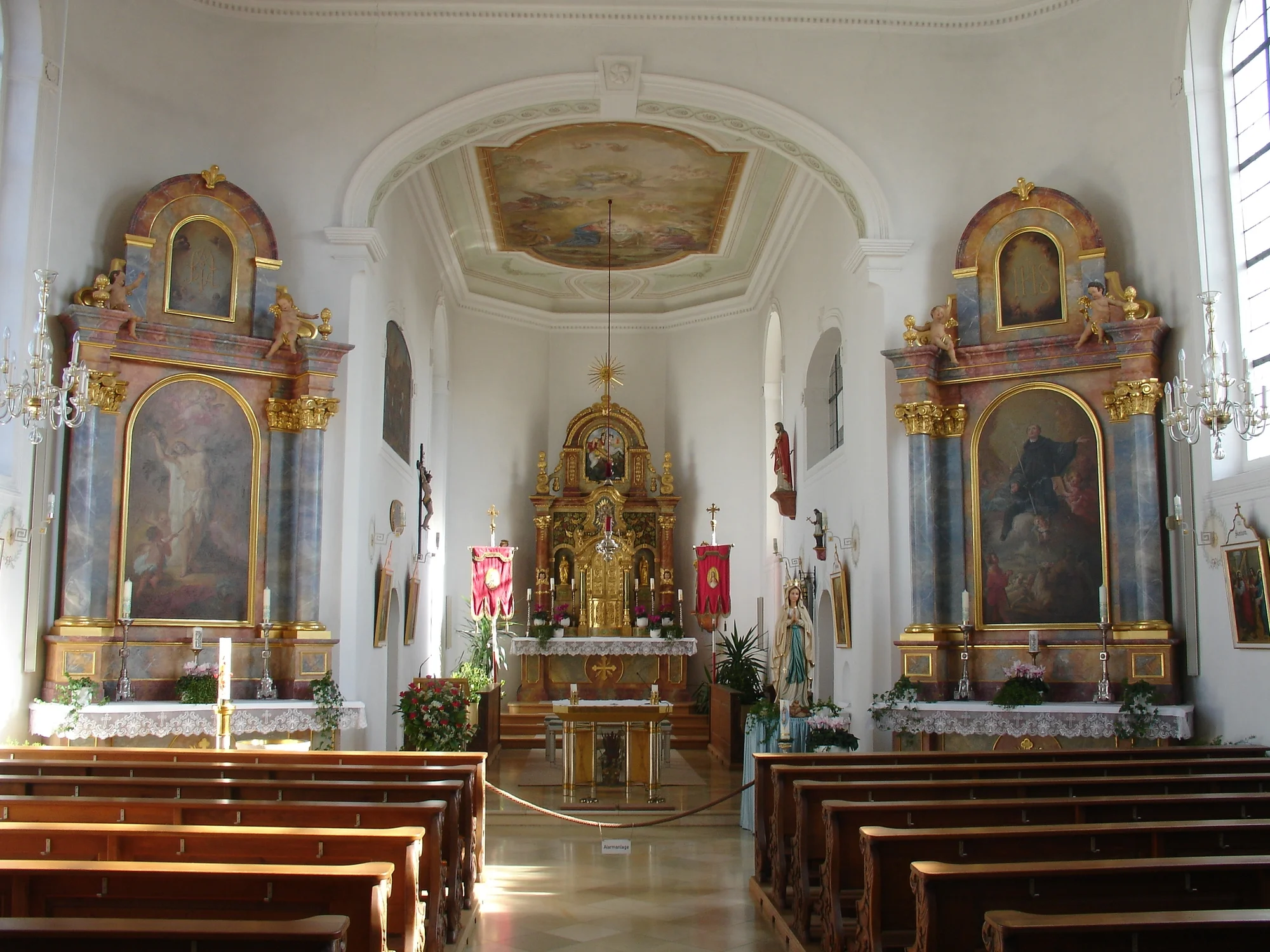 Nach mündlicher Überlieferung wurde die erste Kirche im Jahre 1051 von Papst Leo IX. geweiht. 1792 konnte die Weihe des jetzigen Gotteshauses gefeiert werden. Der Unterbau von Turm und Chor stammt aus dem 15. Jahrhundert. Auf den Decken- und Emporebildern von J.B. Enderle sind die Verherrlichung des Hlg. Georg und die Apostel dargestellt.