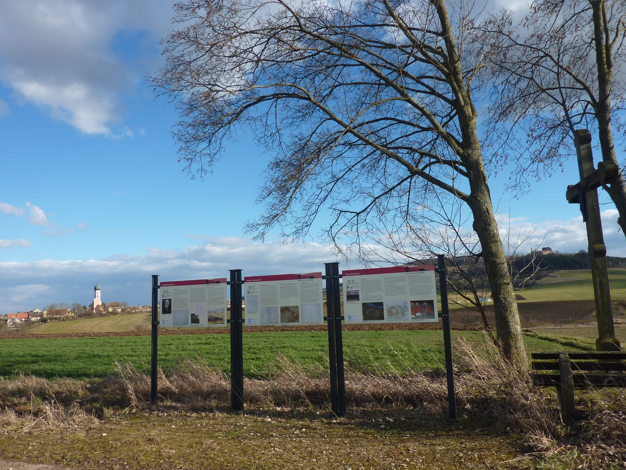 Am Rande eines Ackers stehen drei Informationstafeln neben zwei Bäumen und einem Wegkreuz. In der Ferne ist eine Siedlung mit Kirchturm zu sehen.