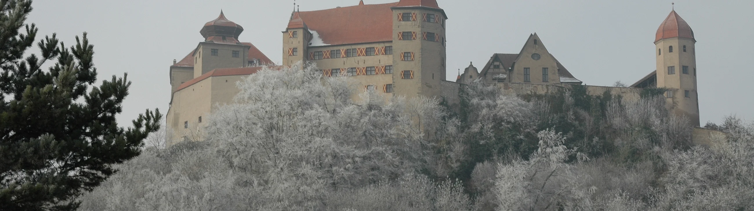 Die Harburg liegt auf einem steilen Bergsporn über der Wörnitz ausserhalb der altbesiedelten Landschaft. Besonders deutlich wird dies daraus, dass sie ohne Bezug zu einer älteren Talsiedlung entstand, ein Vorgang, der im hohen Mittelalter ausserordentlich selten gewesen ist. Erst im Anschluss an die Burg entwickelte sich auf dem engen Talboden zwischen der Wörnitz und dem Burgfelsen die Burgsiedlung. Bei der Burg handelt es sich nicht um einen jener Herrensitze, wie sie als Turmburgen seit der Wende zum 11. Jh. üblich werden. Das grossflächige Burgareal zeigt vielmehr, dass die Befestigung ihrem Typ nach zu einer Gruppe von Herrschaftszentren gehört, die seit dem 9. Jh. im Land östlich des Rheins errichtet werden. Vergleichbare Plätze aus dem 10. und dem Übergang zum 11. Jh. sind z.B. die Reichsburg Cham, die Comburg bei Schwäbisch Hall und die Burgen der Schweinfurter Grafen am Obermain. Da die Befestigungen dieser Art nach der Mitte des 11. Jhs. als Neugründungen nicht mehr bekannt sind, halten wir es für wahrscheinlich, dass auch die Harburg vor dieser Zeit entstanden ist. Eine Errichtung in der ersten Hälfte des 11. Jhs. entspricht zudem gut den internen historischen Notwendigkeiten, die sich aus der Vergabe von Mönchsdeggingen seit 1007 entwickelt haben. Die recht komplizierte Baugeschichte der Burg lässt suich fast ausschliesslich anhand der heute noch stehenden Baulichkeiten ablesen (Abb.2), da Urkunden und sonstige diesbezügliche Notitzen weitgehend fehlen. Zum ältesten Bestand aus dem 12. /13. Jh. gehören die Grundmauern des inneren Berings der hauptburg sowie die beiden quadratischen Haupttürme im Burghof, der Diebsturm (ehemals Bergfried) und der faulturm. In die gleiche romanische Bauperiode datiert das Palas (Fürstenbau), der allerdings Ende des 16. Jhs. an der Nordostecke einen Erker erhielt und während des 17. Jhs. im Innern umgebaut wurde. Die mächtigen Zwingermauern an der meistgefährdeten Süd- und Südwestseite der hauptburg wurden im 14. und 15. Jh. aufgeführt. Wohl zur gleichen Zeit erfolgte der Ausbau der weitläufigen Vorburg (u.a. die Rote Stallung zwischen Unterem und Oberem Tor). Graf Wolfgang I. (1455 - 1522) liess den Saalbau, der 1496 fertiggestellt war, zwischen Diebs- und Faulturm errichten. 1717 wurde er um ein weiteres Stockwerk erhöht. Die Stuckierung des dort gelegenen Rittersaales 1742 durch J. Bühler schuf den kunstgeschichtlich bedeutensten profanen Innenraum der gesamten Burganlage. In der zweiten Hälfte des 16. Jhs.herrschte zur Zeit des Grafen Gottfried (1554 - 1622) wieder ein reger Baubetrieb auf der Harburg. Um 1562 wurde die ehemalige Burgvogtei neben dem Oberen Tor errichtet, 1585 der Glockenturm nordöstlich der Kirche erhöht und 1588 die Pfisterei (Backhaus) mit dem zierlichen Türmchen fertiggestellt. Schliesslich erbaute er 1594/95 das sog. Kastenhaus (Neuer Bau) an der Westseite des Burghofes, in dem sich später die Rüstkammer, der Marstall und der Haberkasten befanden. Endlich wurde 1616 das obere Schlosstor erneuert. Nach Beseitigung der Schäden des Dreißigjährigen Krieges folgte im 18. Jh. der weitere Ausbau der Bergfeste zur wohnlichen Schlossanlage. Seit den 40er Jahren des 18. Jhs. konzentrieren sich die Bauarbeiten auf Schloss Harburg vor allem auf die Errichtung neuer Gebäude für die Oberamtsverwaltung und für die Schlosswirtschaft (1743 Amtshaus, 1744 Amtspflegerhaus, 1748 Bräuhaus, 1753 Baumeisterhaus, 1786 Roßwette), die sich sämtlich in der Vorburg befanden. Seit dieser zeit haben kleinere architektonische Veränderungen dem alten Baubestand des Schlosses nicht mehr viel anhaben können, so dass es sich dem heutigen Besucher in seinem barocken Zustand nahezu unverfälscht darbietet.