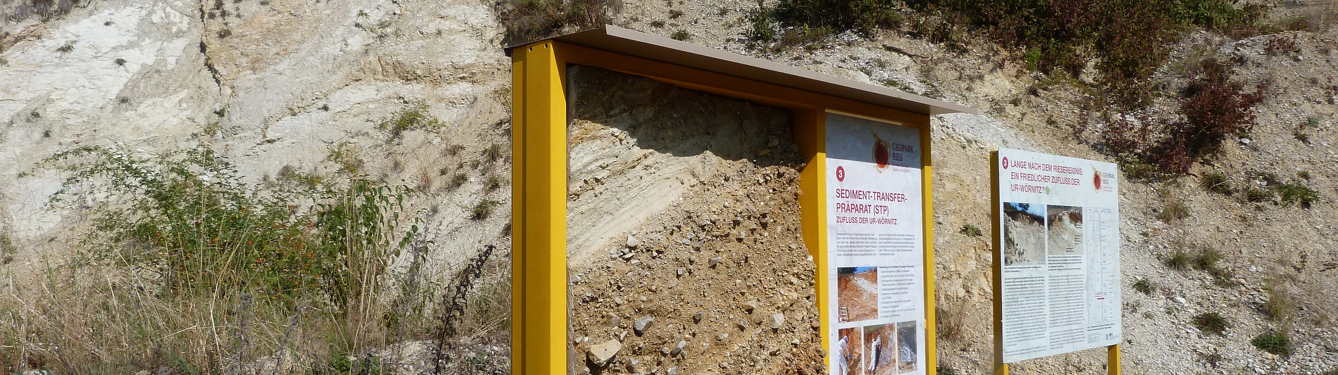 Nach einem Aussichtspunkt mit Panoramablick ins Ries erhalten wir in den Aufschlüssen am Glaubenberg Einblick in das Schollenmosaik im Bereich der südöstlichen Megablockzone. Auch die Gerölle eines ehemaligen Flusslaufs sind hier aufgeschlossen – eine große Seltenheit im Ries – sowie Eisenerze in einer Doggerscholle.
