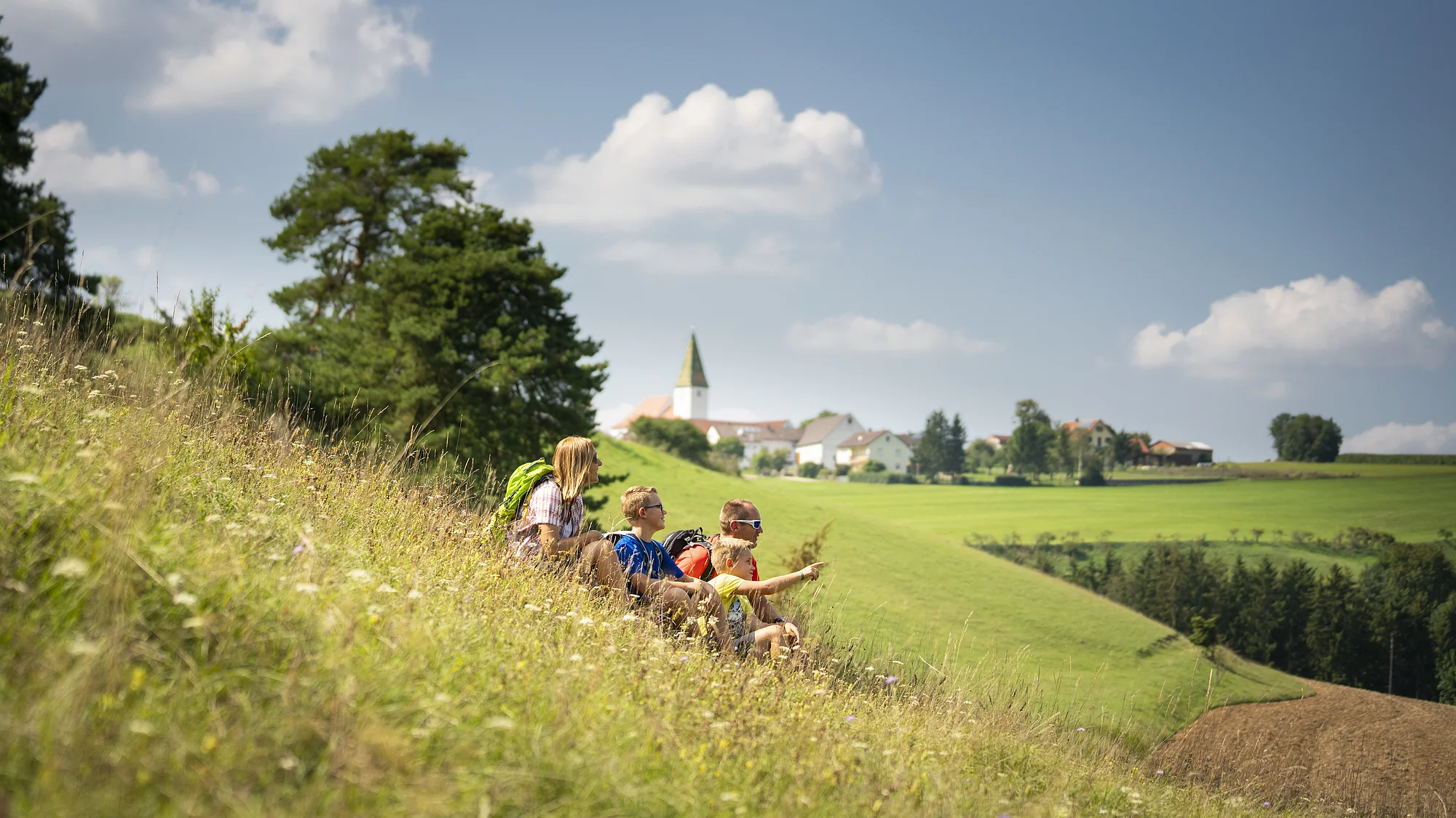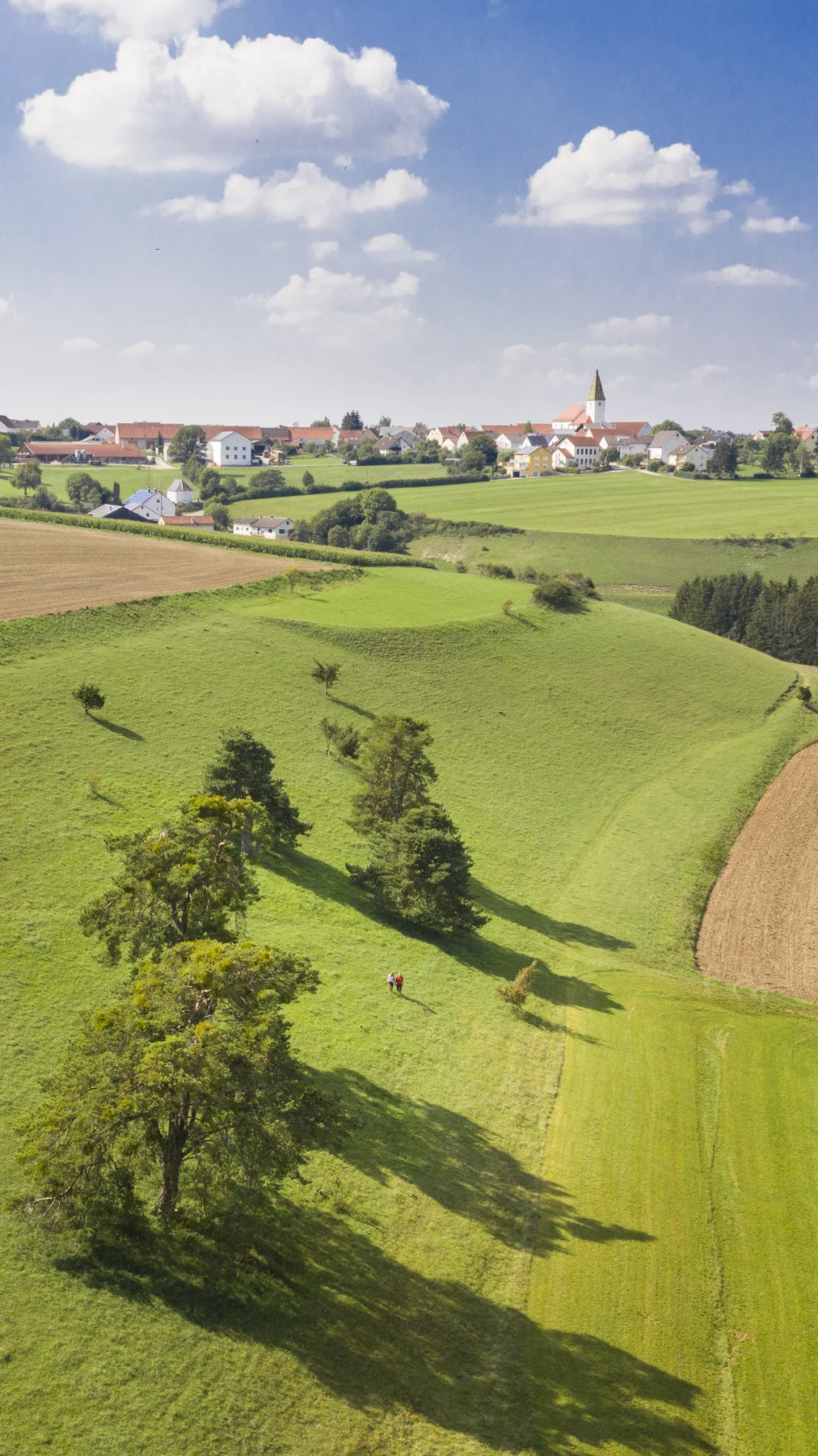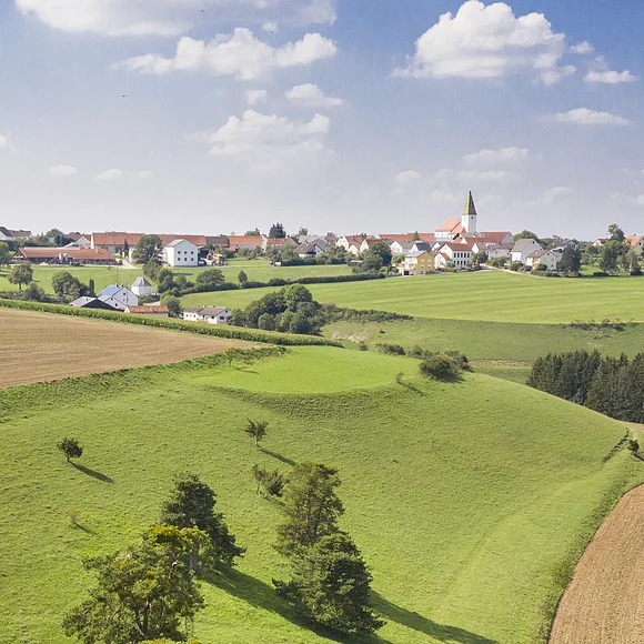Am Sportgelände verlässt der Nadlerrundweg den Wallfahrerweg wieder. Für uns geht es nach Norden am Waldrand und an einer Hecke entlang zu einer Höhenkante. Dort haben wir noch einmal einen imposanten Blick auf Rögling, ehe uns die Markierung zurück in den Ort führt.