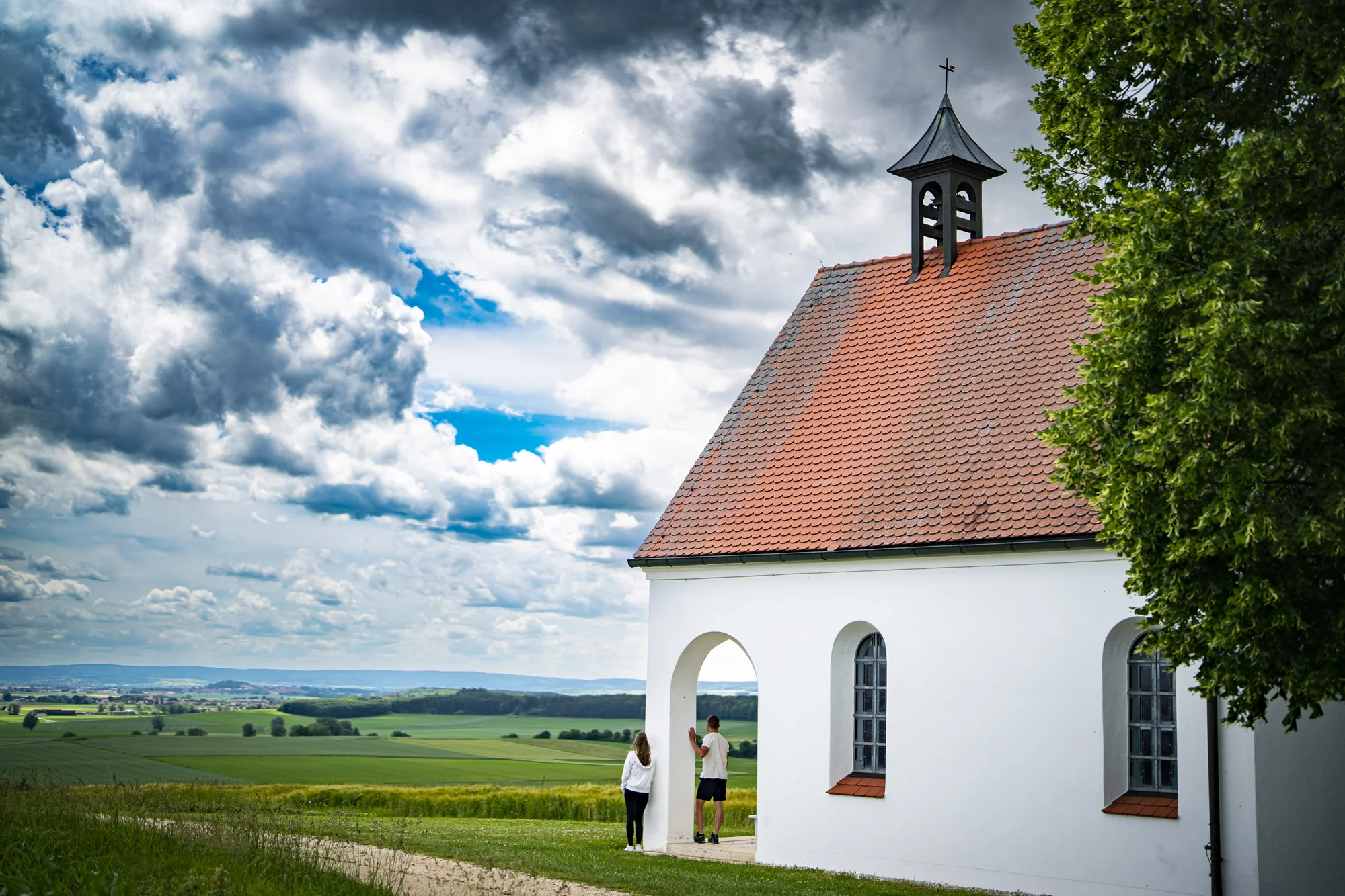 The third stage begins with the ascent from Oettingen to the Rossfeld, which has a richly structured man-made landscape. Fields and meadows alternate with heaths grazed by flocks of sheep, traditional meadow-orchards woods, field margins and hedgerows. Here you pass a station of the Franconian Moststraße (Must Road, “Must” meaning a traditional fruit wine). Again and again, grand panoramic views open up into the Wörnitz valley. Outside of Ehingen the trail leads past a multidenominational fortified church, which is used as a Catholic and Protestant parish church. The path leads through agricultural fields to the Antonius Chapel with peace cross and a lovely view. The burial-mound field Heide near Hochaltingen bears witness to the middle Hallstatt period, when the custom of burial within a chamber under an earthen mound was widespread. Passing the Weidenkapelle (chapel), you reach Fremdingen and further to the Ölberg Chapel idyllically situated at the edge of the woods. The third stage ends in Raustetten.